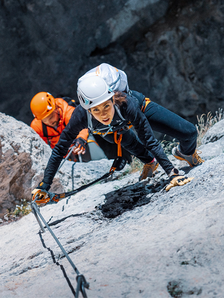 Passo dopo passo verso la vetta. La nostra attrezzatura da via ferrata è intuitiva e sicura: così potrai scalare in tutta sicurezza e goderti ogni singolo passo durante la salita.