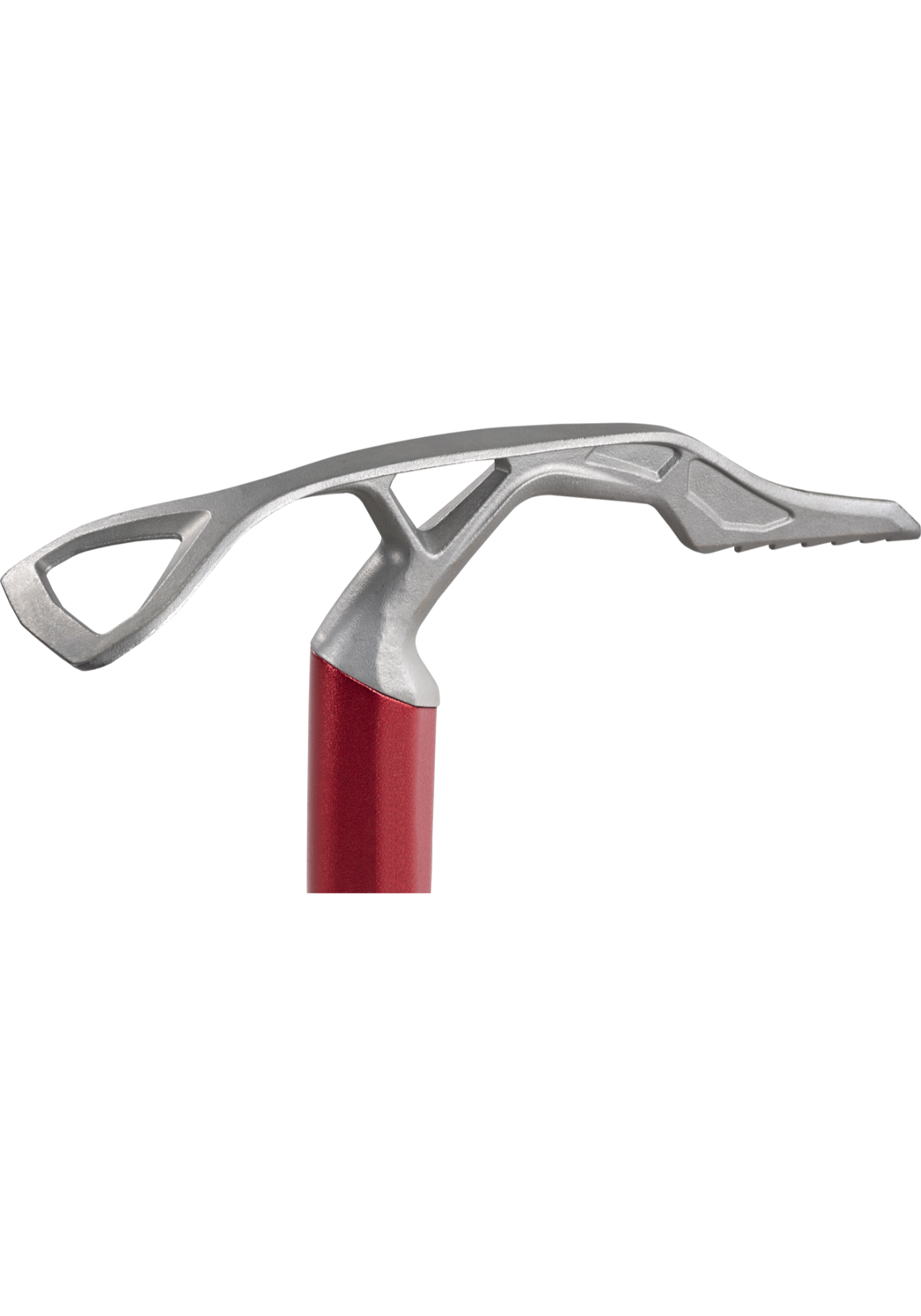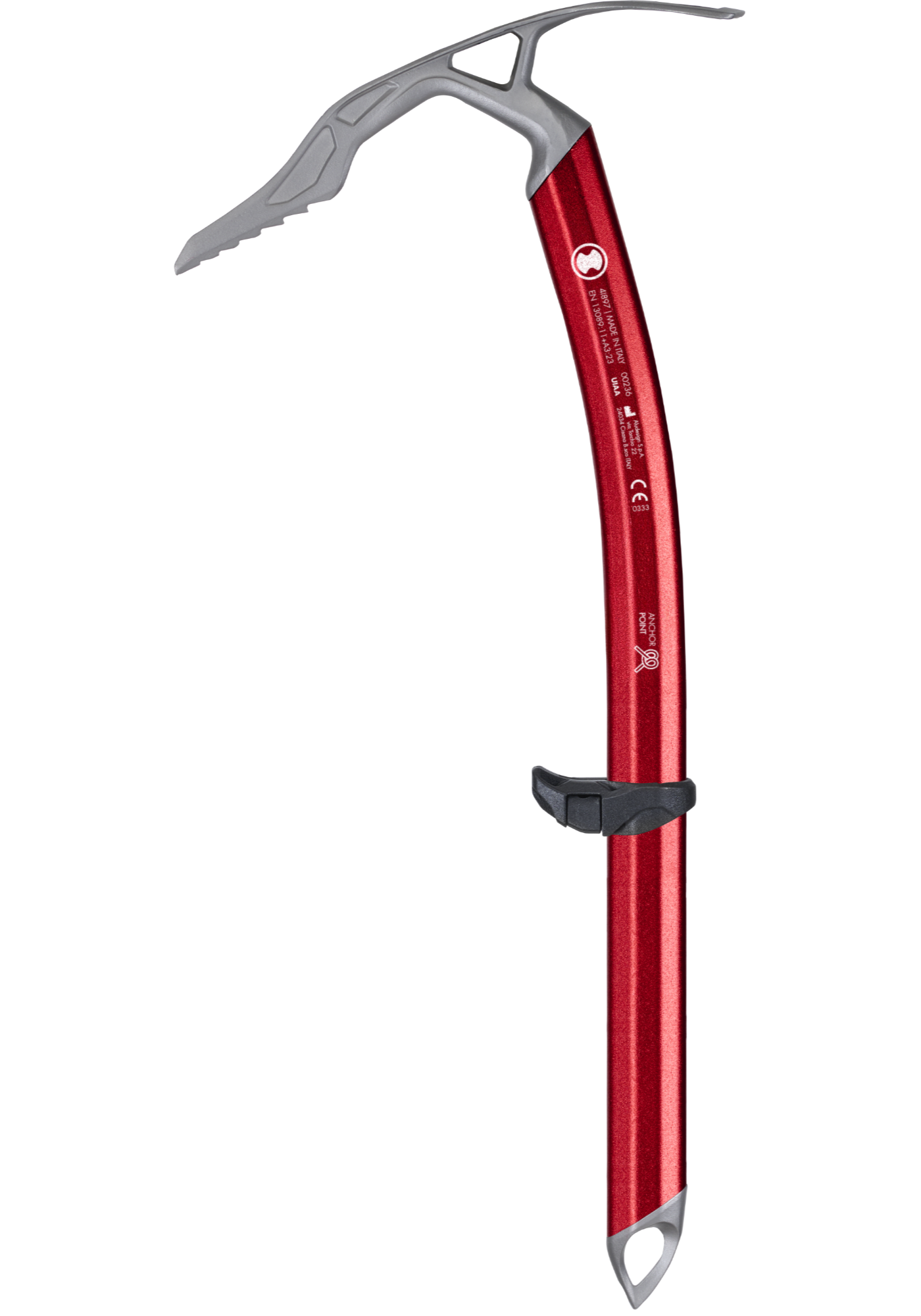 Piccozza tecnica polivalente per canali di neve, pareti nord di pendenza moderata e creste di misto. Presenta una testa ergonomica in acciaio inox e un manico curvo in lega leggera con finitura differenziata.