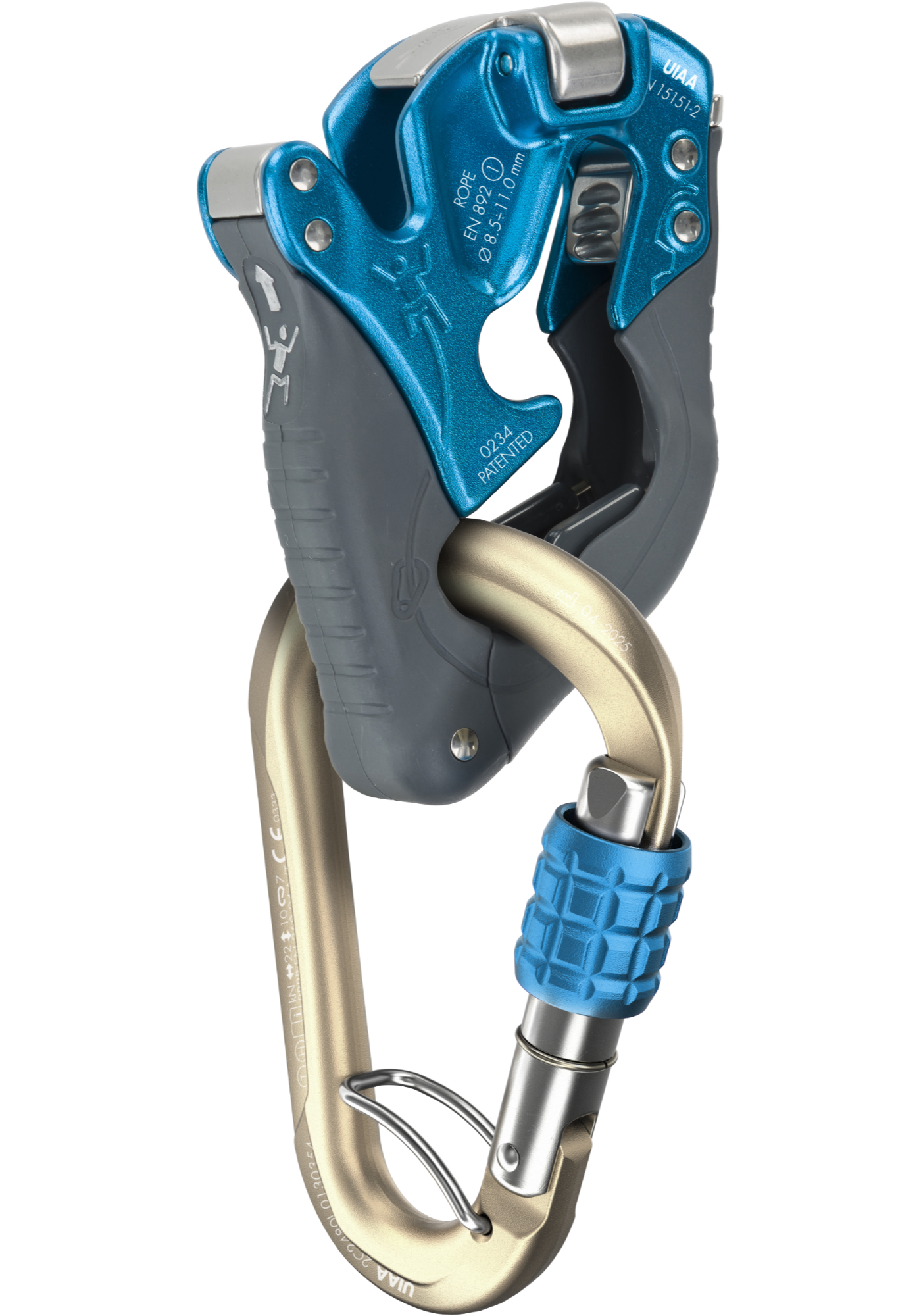 CLICK UP+ viene fornito e deve essere usato con l’apposito moschettone HMS TONDO SGL HC, con anodizzazione anti-usura e sistema ACL che previene la possibilità di carico sull’asse minore.