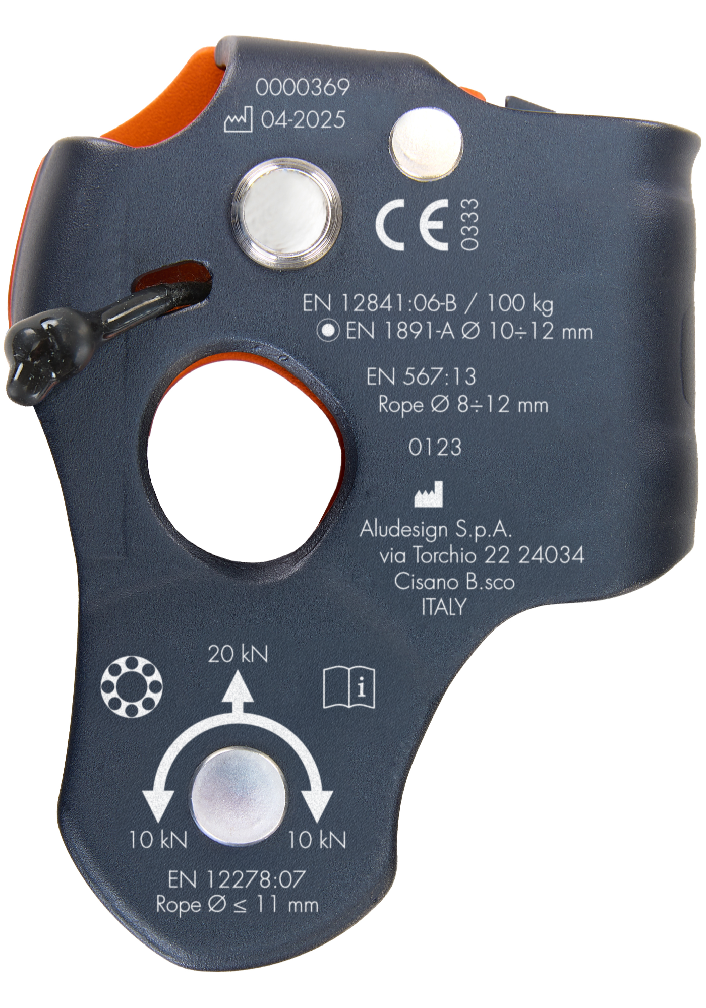 - la puleggia integrata con cuscinetti a sfera può essere utilizzata come rimando diretto per la risalita agevolata di una corda o per il sollevamento di una persona senza l’ausilio di connettori aggiuntivi (modalità bloccante/carrucola);