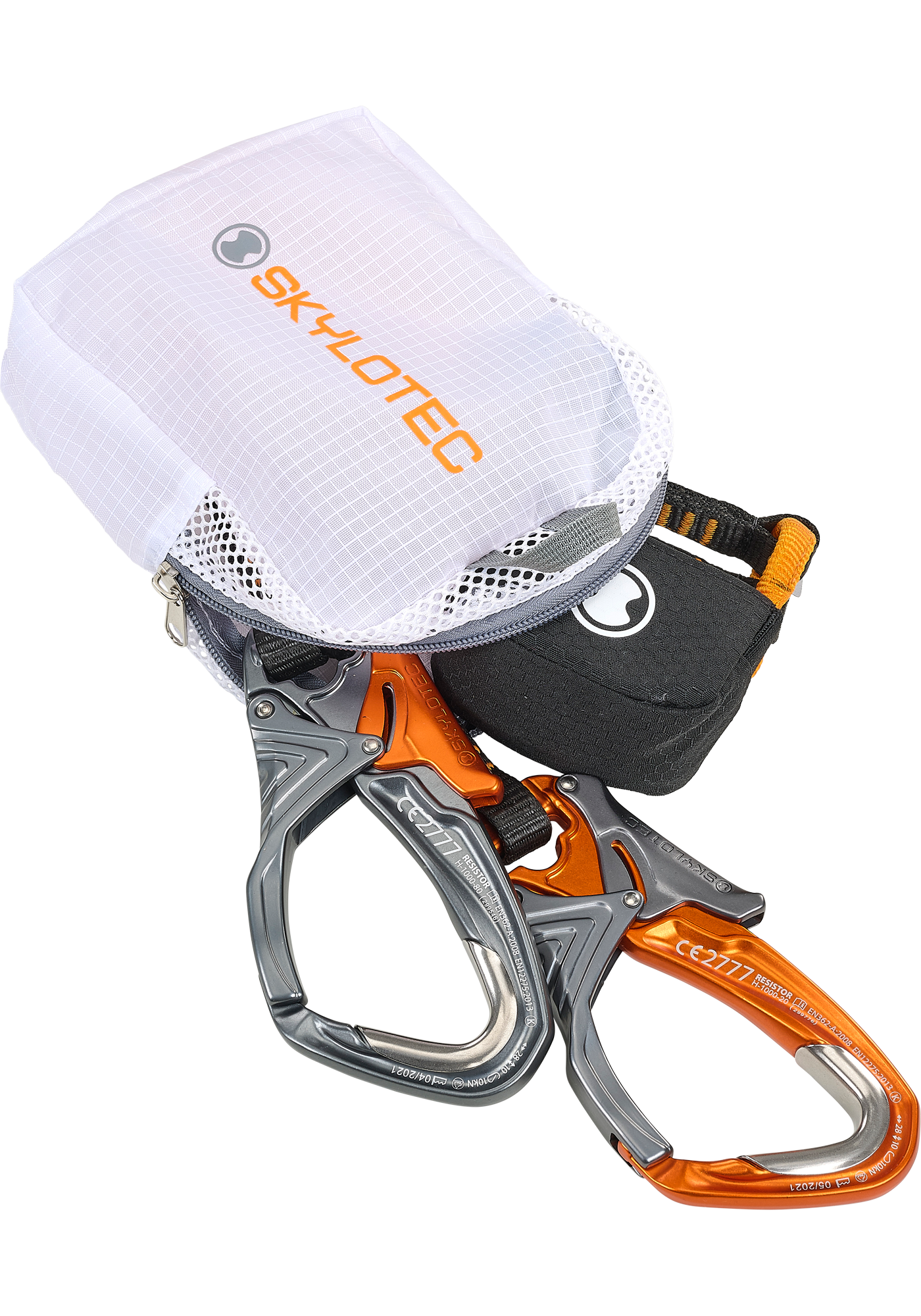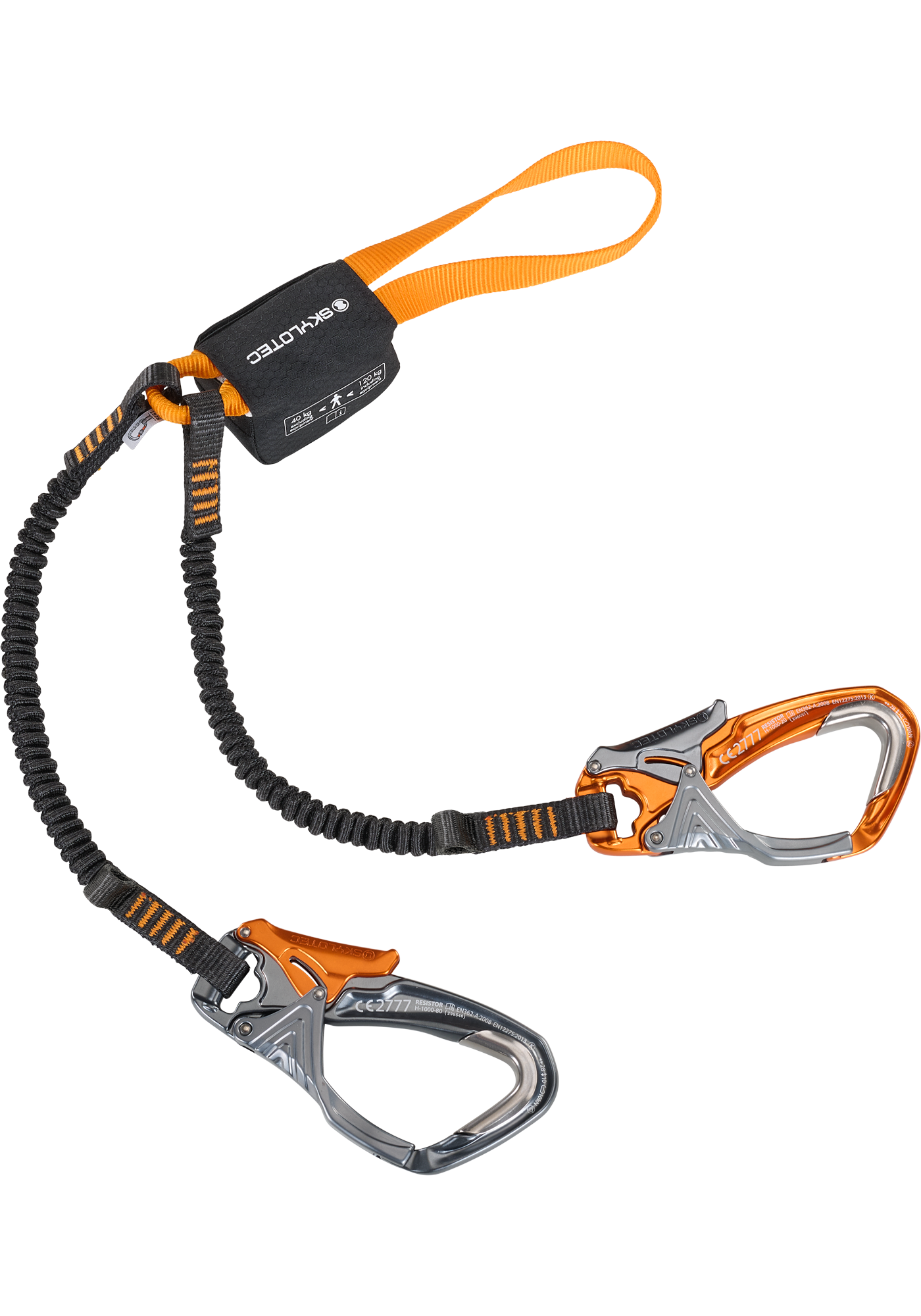Set da ferrata ultra-compatto con bracci elastici ad ingombro ridotto, moschettoni ergonomici e sistema a prova di errore a 180°.