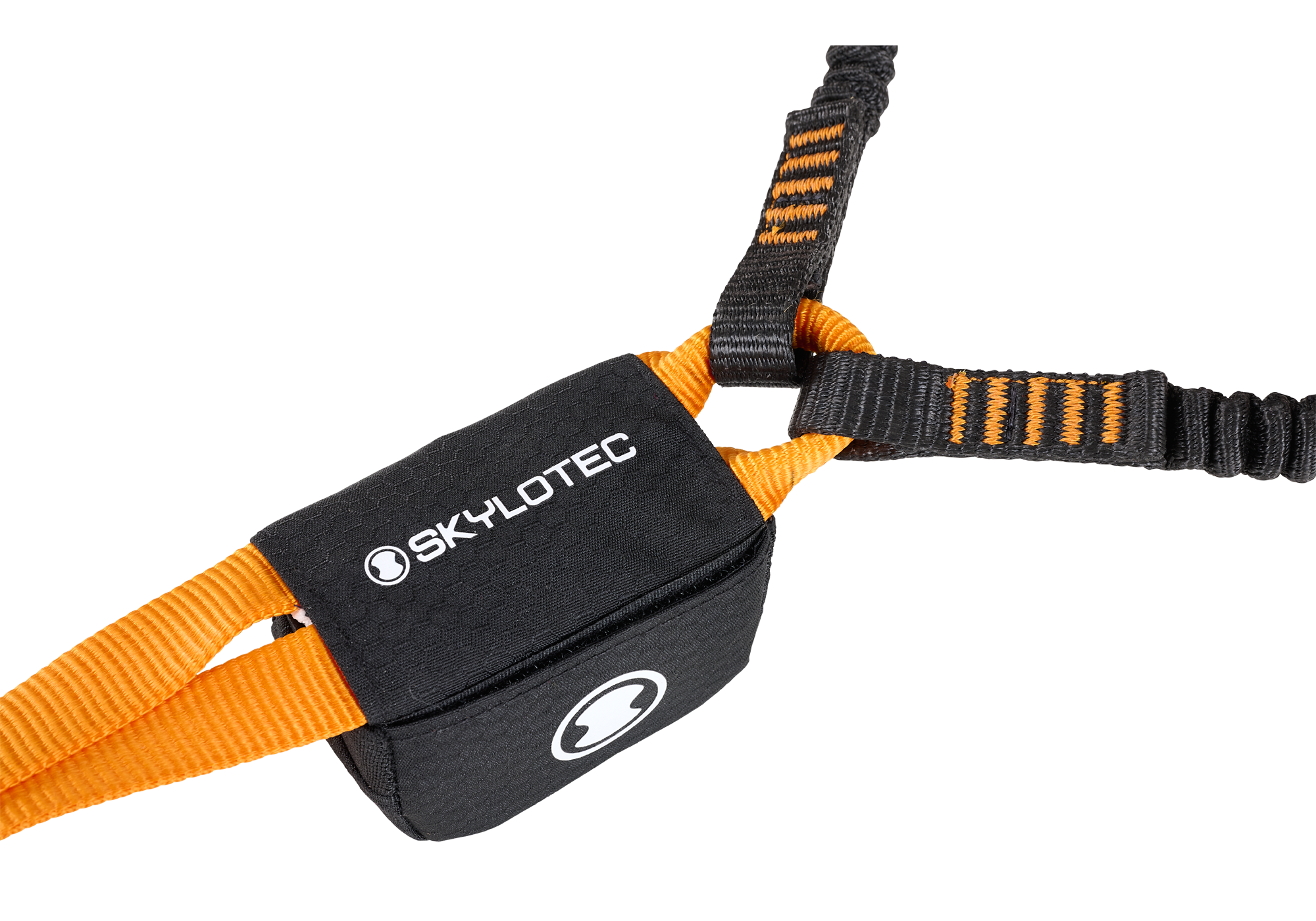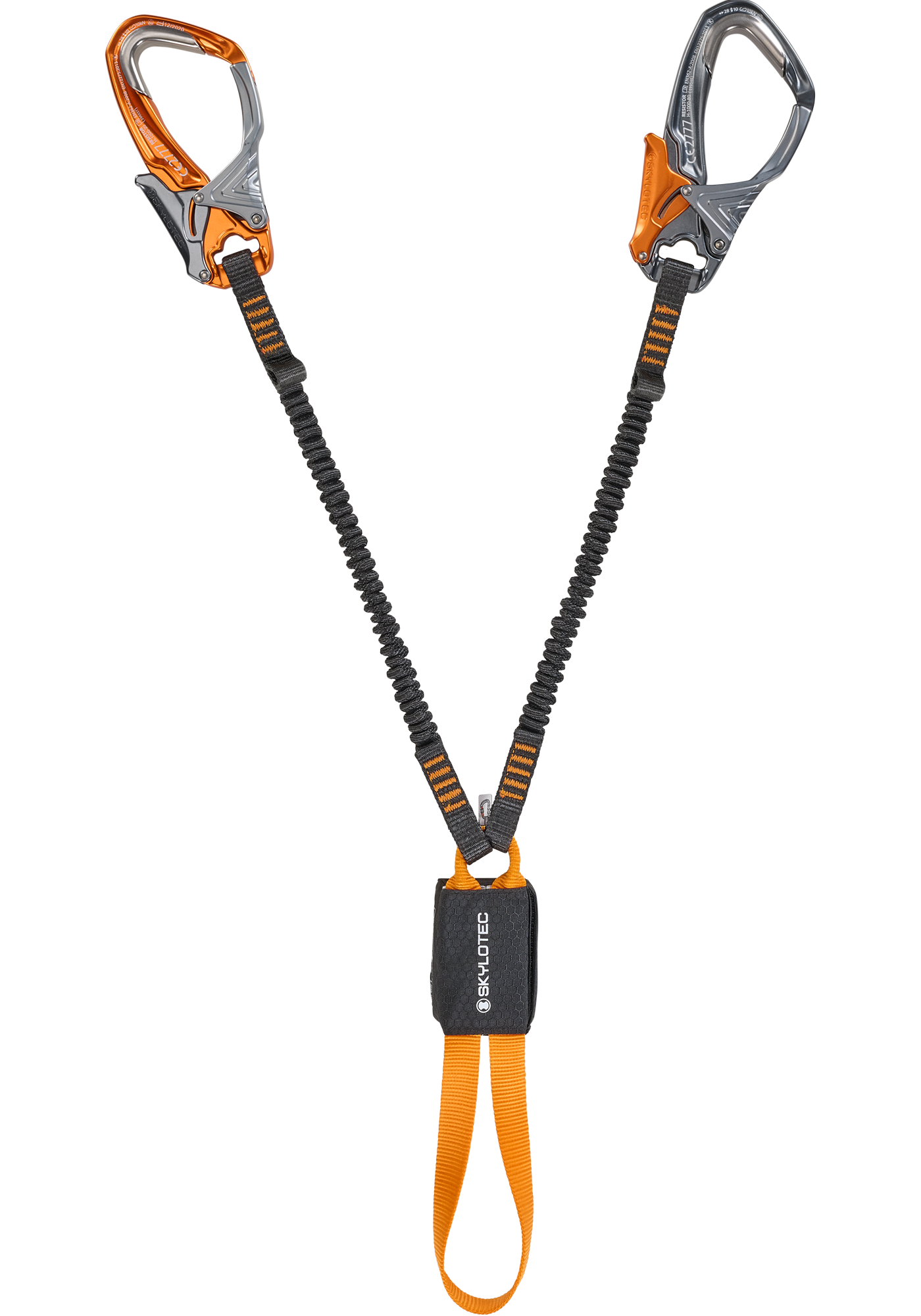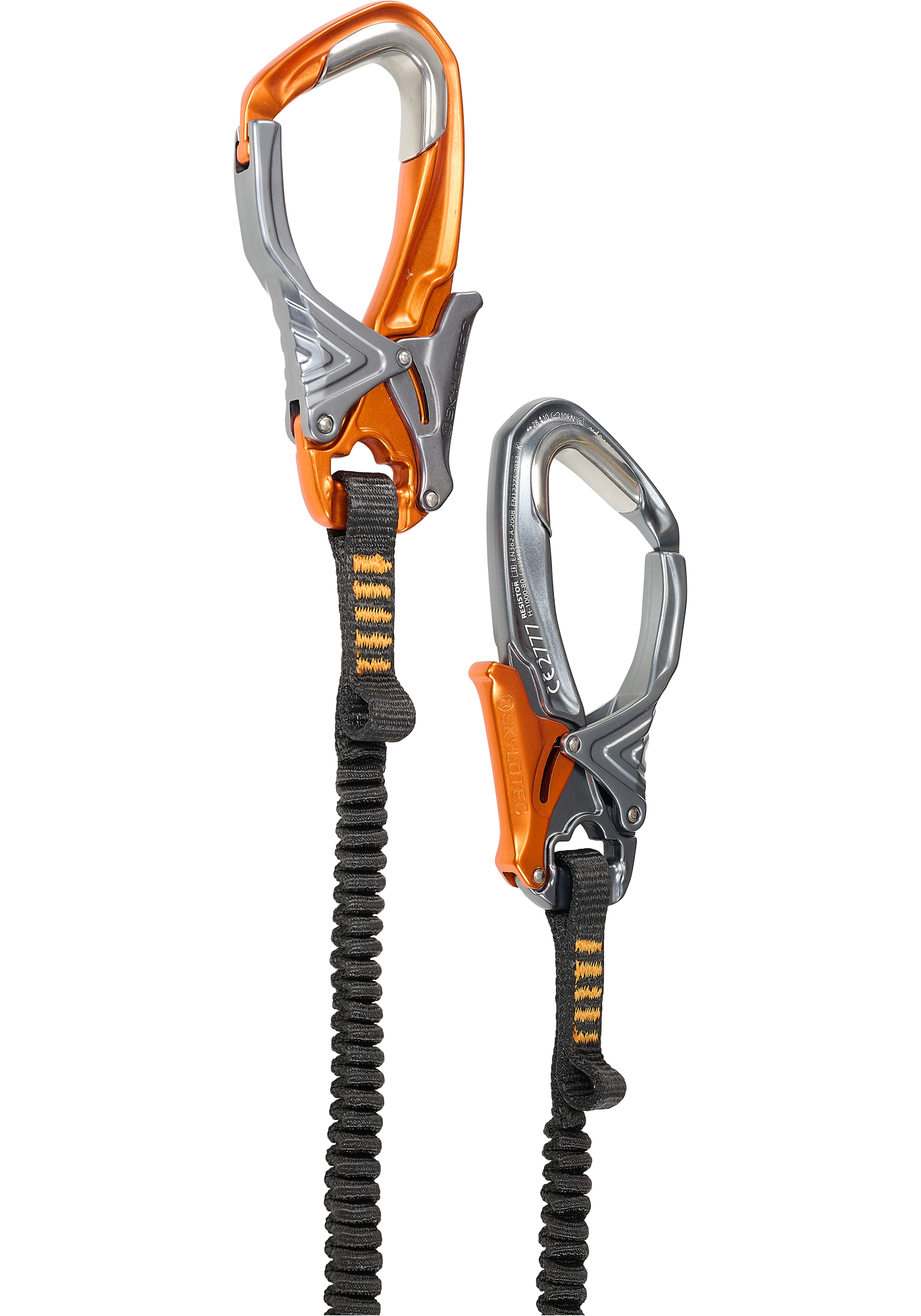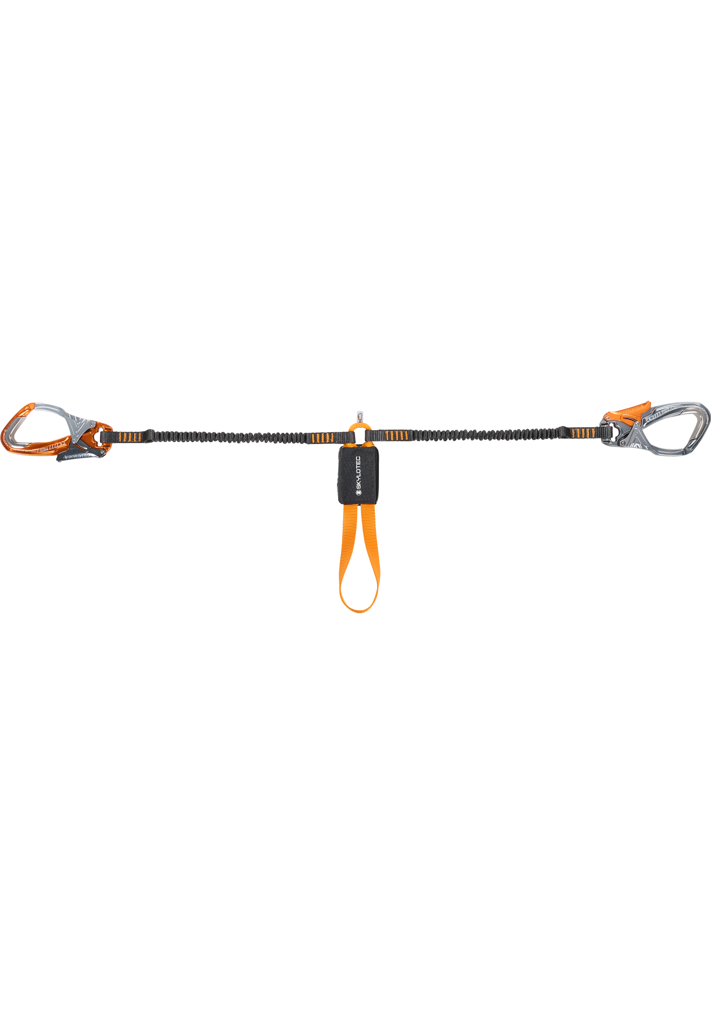 - progettato per ridurre il rischio di utilizzo improprio a 180°, laddove, durante l’utilizzo, uno dei moschettoni venga erroneamente agganciato a una parte portante dell’imbracatura; bracci elastici in polietilene ad altissimo peso molecolare (UHMWPE);